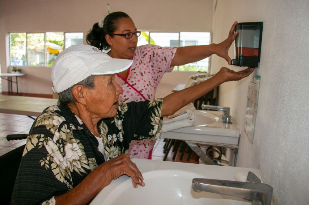 Asimismo, los adultos mayores son apoyados para que laven sus manos con frecuencia, antes y después de cada alimento, de tener contacto con alguna superficie u objeto, además de mantener la distancia mínima de un metro y medio entre cada uno para evitar el contacto de riesgo.