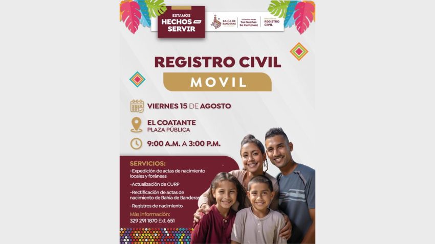 El próximo viernes 15 de agosto, la comunidad de El Coatante contará con la visita del programa Registro Civil Móvil, una iniciativa que busca acercar los servicios de esta dependencia a las localidades del municipio, facilitando la realización de trámites de forma rápida y accesible.