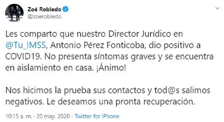 Aquí el tuit emitido por Robledo: «Les comparto que nuestro Director Jurídico en @Tu_IMSS, Antonio Pérez Fonticoba, dio positivo a COVID19. No presenta síntomas graves y se encuentra en aislamiento en casa. ¡Ánimo!