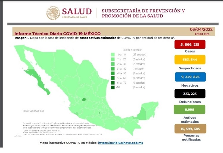 Agregó que hay 8 mil 998 casos activos, es decir personas que presentaron síntomas en los últimos 14 días y que la semana epidemiológica abre con 19 por ciento menos de casos estimados en comparación con la pasada.