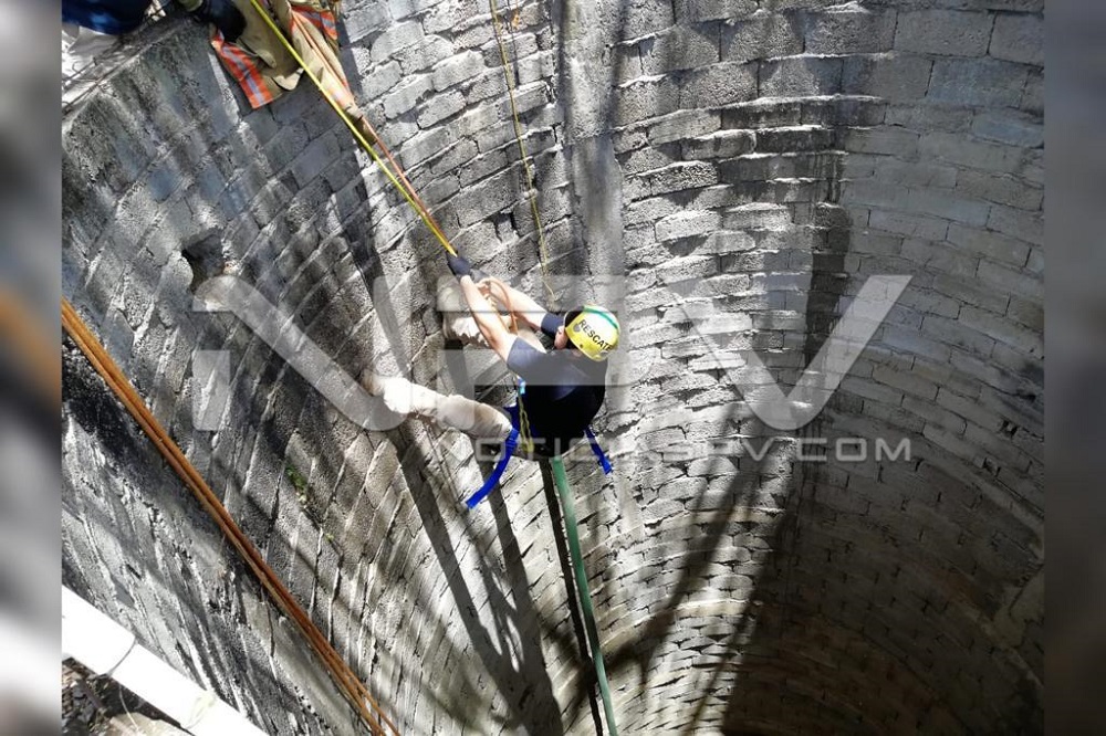 La persona del sexo masculino se apreciaba lesionado, por lo que inmediatamente los rescatistas empezaron a realizar maniobras, para descender a rapel al fondo del pozo, y luego de algunos minutos de tensión lograron asegurarlo y rescatarlo para lo que utilizaron una camilla rígida, soga, además de equipo especial para realizar este tipo de rescates.