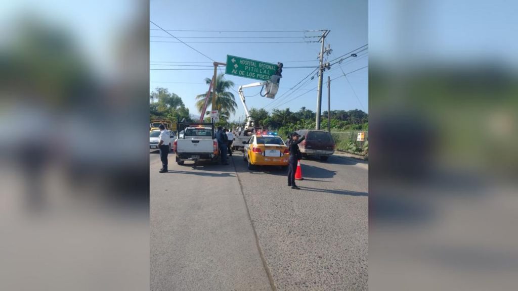 En lo que respecta al semáforo localizado en el cruce de las avenidas México y avenida Los Poetas, fue necesario utilizar una grúa (canastilla) para poder conectar el cableado y restablecer el servicio.