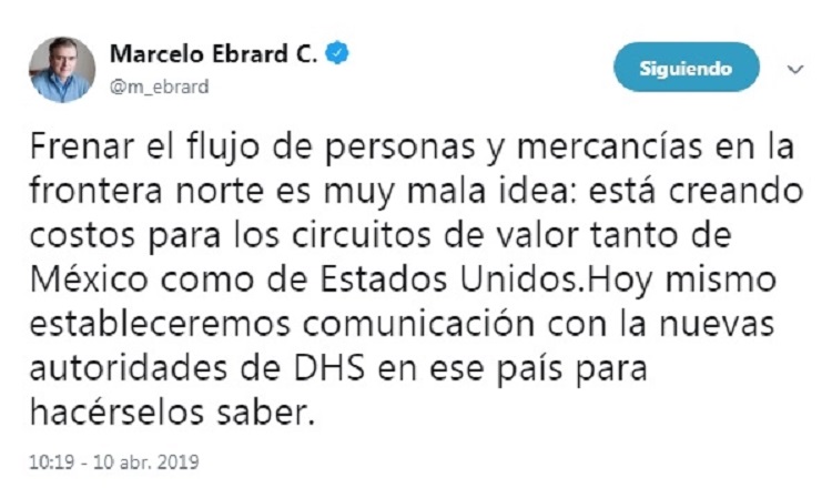 “Frenar el flujo de personas y mercancías en la frontera norte es muy mala idea: está creando costos para los circuitos de valor tanto de México como de Estados Unidos. Hoy mismo estableceremos comunicación con la nuevas autoridades de DHS en ese país para hacérselos saber”, escribió el titular de la Secretaría de Relaciones Exteriores en su cuenta de Twitter (@m_ebrard).