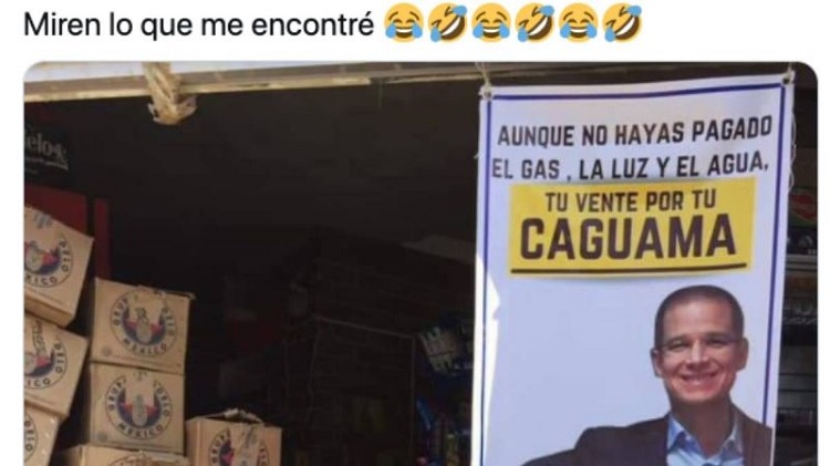 “Miren lo que me encontré”, escribió en su cuenta de Twitter, junto con emojis de risa y la fotografía de la fachada de una tienda con hay una pancarta donde se ve él recargado sobre una botella de cerveza, con la promoción de tres por 100 pesos y la leyenda: “Aunque no hayas pagado el gas, la luz y el agua, tu vente por tu caguama.”