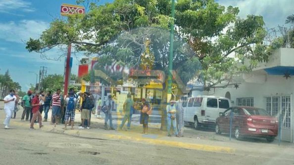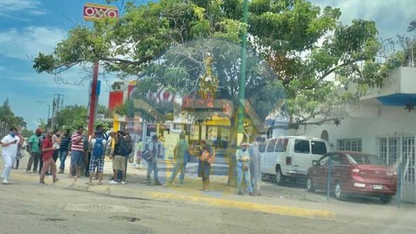 Grave riesgo de posible contagio de Covid-19 afuera de la tienda de conveniencia OXXO, en la glorieta de El Tigre en Nuevo Vallarta, Nayarit.