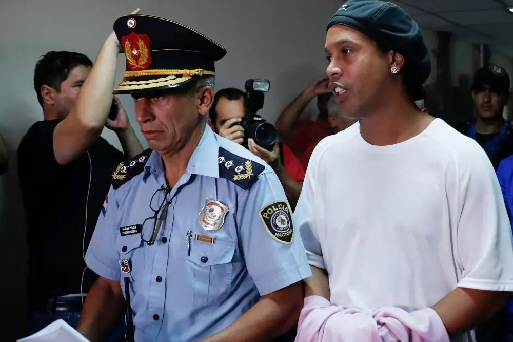 Ronaldinho, de 39 años, y su hermano Roberto Assis fueron arrestados la noche del jueves en un hotel de la capital de Paraguay. Ambos aparecieron el sábado esposados y Ronaldinho trataba de ocultar las esposas bajo un trozo de tela lila.