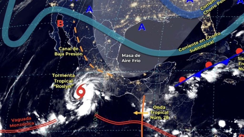 Durante las próximas horas, Roslyn ocasionará lluvias puntuales intensas (de 75 a 150 milímetros [mm]) en regiones de Colima, Guerrero y Michoacán; muy fuertes (de 50 a 75 mm) en zonas de Jalisco; rachas de viento de 60 a 80 (km/h) con oleaje de 3 a 5 metros (m) de altura en las costas de Colima, Jalisco y Michoacán, así como de 50 a 60 km/h y oleaje de 1 a 3 m de altura en el litoral de Guerrero.