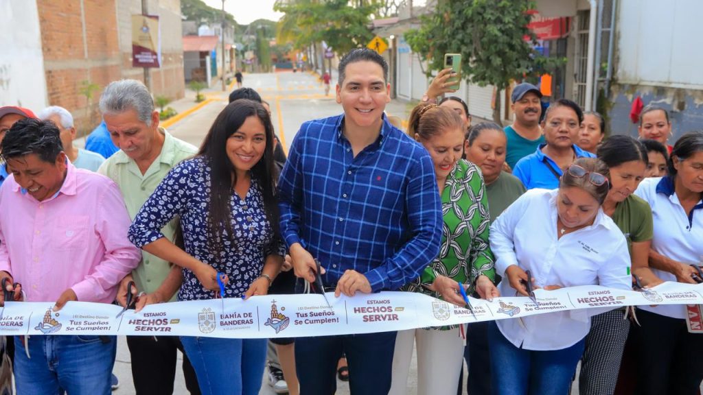 El presidente municipal de Bahía de Banderas, Héctor Santana García, entregó las calles Primavera y 20 de Noviembre en Mezcales, que ahora cuentan con pavimento hidráulico, banquetas, señalización y mejoras en servicios básicos. Estas obras, que benefician directamente a la comunidad, forman parte de su compromiso con la modernización del municipio.
