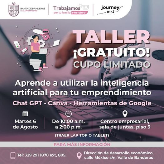 Bahía de Banderas Nay., 5 de agosto de 2024.- La dirección de Desarrollo Económico, del XI Ayuntamiento de Bahía de Banderas, llevará a cabo el taller de Inteligencia Artificial para el Emprendimiento, esto como continuación a las capacitaciones que se han ido implementando para emprendedores, artesanos y empresarios de MIPYMES (micro, pequeña y mediana empresa).