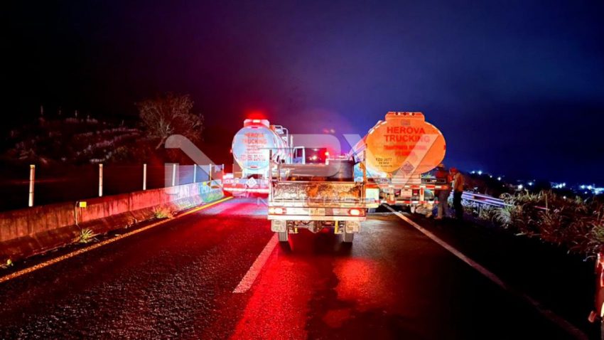 Cabe mencionar, que aún continúa lento el paso vehicular ya que se encuentran en el trasvase de la gasolina, siendo habilitado un carril donde elementos de la Policía Estatal brindan abanderamiento y seguridad vial.