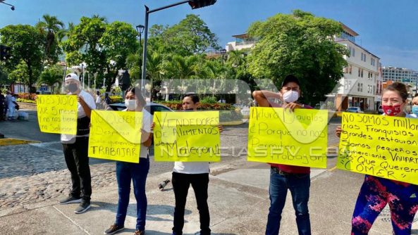 Vendedores de comida, antojitos y postres para llevar del malecón 2, se manifestaron esta mañana frente a palacio municipal en el centro, con el objetivo de que la autoridad les otorgue el permiso correspondiente para trabajar, luego de cinco meses de contingencia por el Covid-19.