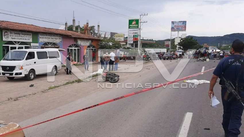 El accidente ocurrió sobre la carretera federal 200 junto a la gasolinera La Colmena en La Peñita de Jaltemba, donde los conductores chocaron y quedaron tirados sin vida en el pavimento