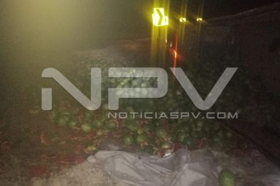Muere trailero prensado al volcar con el torton que conducía cargado de sandía.