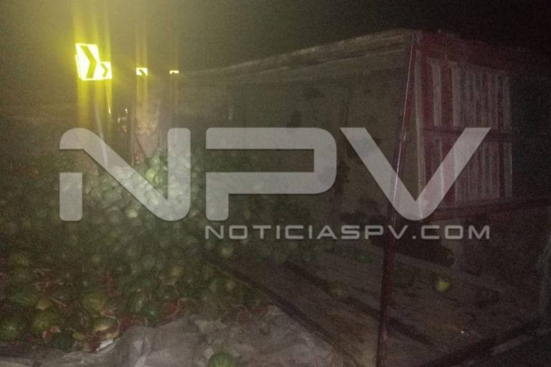 Muere trailero prensado al volcar con el torton que conducía cargado de sandía.