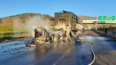 “Los hechos se derivaron luego de recibir un reporte donde señalarán un vehículo en siniestro, de inmediato personal de Protección Ciudadana y Bomberos, Policía Estatal y Guardia Nacional Seguridad Carreteras se trasladaron hasta el lugar, identificando un tracto camión en llamas, mismo que posiblemente sufrió un falla eléctrica”, informó la dependencia estatal.