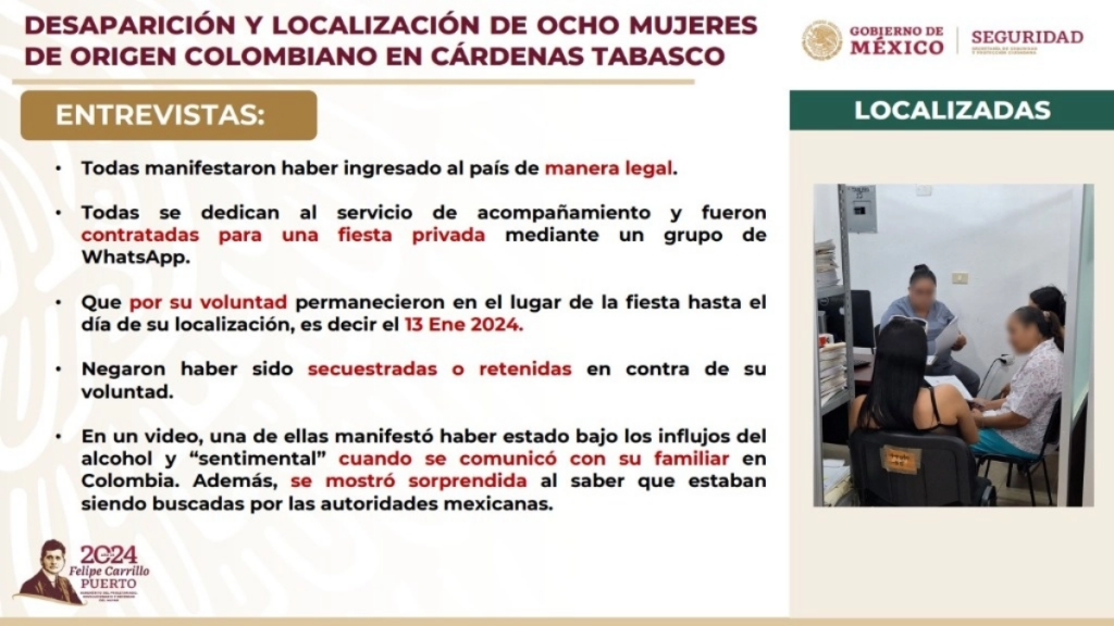 Durante la mañanera del presidente Andrés Manuel López Obrador, al presentar los avances en las indagatorias sobre la presunta desaparición —ellas declararon no haber sido víctimas de ese delito—, el funcionario afirmó que las mujeres extranjeras dijeron dedicarse al servicio de acompañamiento, sin embargo, para entrar a nuestra nación declararon que entraban como turistas.