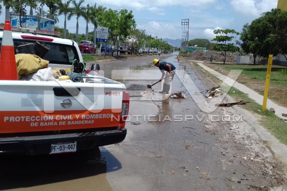 Este domingo 14 de Julio, los elementos de la Unidad de Protección Civil Municipal de Bahía de Banderas, fueron alertados de varios taponamientos en bocas de tormentas ubicadas frente a la tienda Mega, en la zona de Flamingos, de Bucerías, donde ya estaban resultando afectadas las vías sobre el Boulevard Riviera Nayarit, debido al encharcamiento de agua que ocasionó la lluvia que cayó en esa área.
