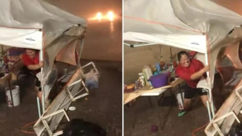 El fenómeno meteorológico parecía no dar tregua y tanto la señora como otra persona trataban de sostener al puesto de alimentos mientras el fuerte viento y la lluvia azotaba, volteando una banca de metal y tirando sillas de plástico.
