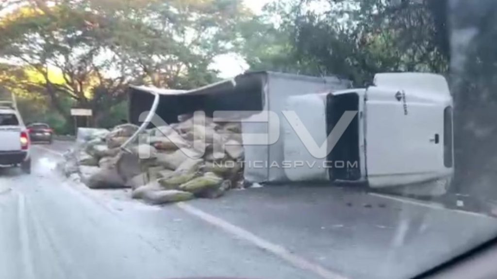 Aparatosa volcadura de un torton se registró por la carretera federal 200, cerca del crucero a la Cruz de Huanacaxtle, en Bahía de Banderas, hasta donde arribó el personal de Bomberos de Nayarit, para auxiliar al conductor que afortunadamente resultó ileso, tomando nota los oficiales de la Guardia Nacional, (División Caminos).