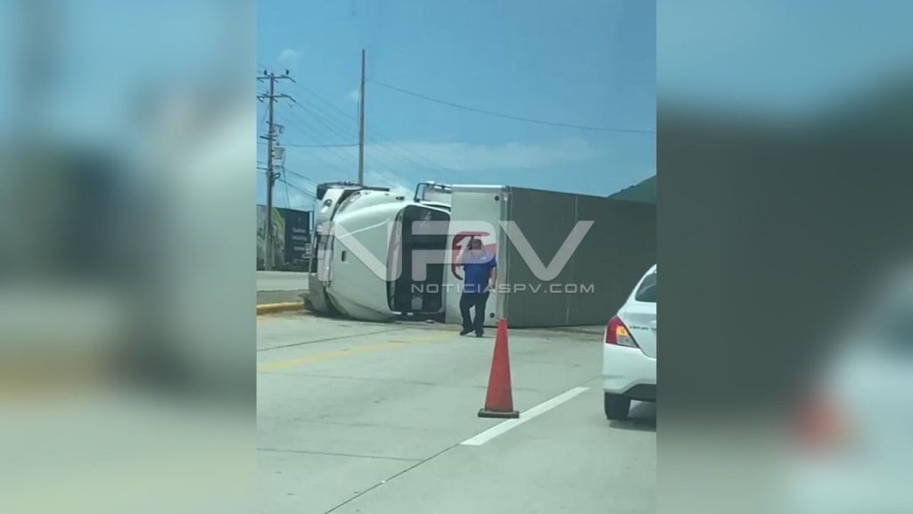 Fuerte accidente vehicular se registró sobre el boulevard Riviera Nayarit poco antes de llegar al crucero de La Cruz de Huanacaxtle, en donde un camión de carga se volcó en uno de los carriles y parte del acotamiento.