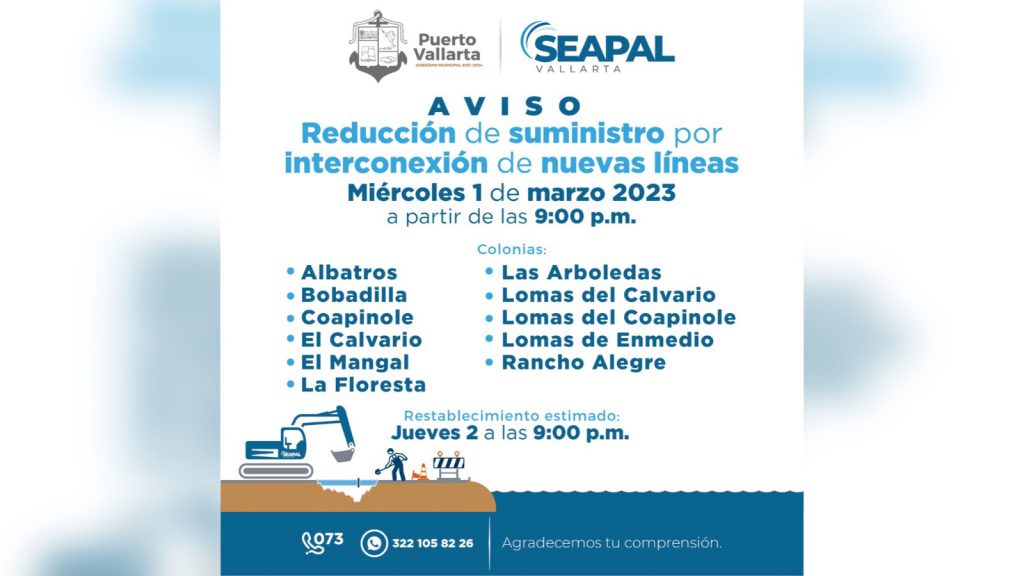 SEAPAL Vallarta agradece el apoyo y comprensión de la ciudadanía y los exhorta a almacenar agua previamente y a hacer un uso racional de la misma, recordando que estas obras de modernización tienen un beneficio a largo plazo para elevar el nivel de vida de los vallartenses, una instrucción constante del Profesor Luis Alberto Michel Rodríguez, alcalde de esta ciudad portuaria.