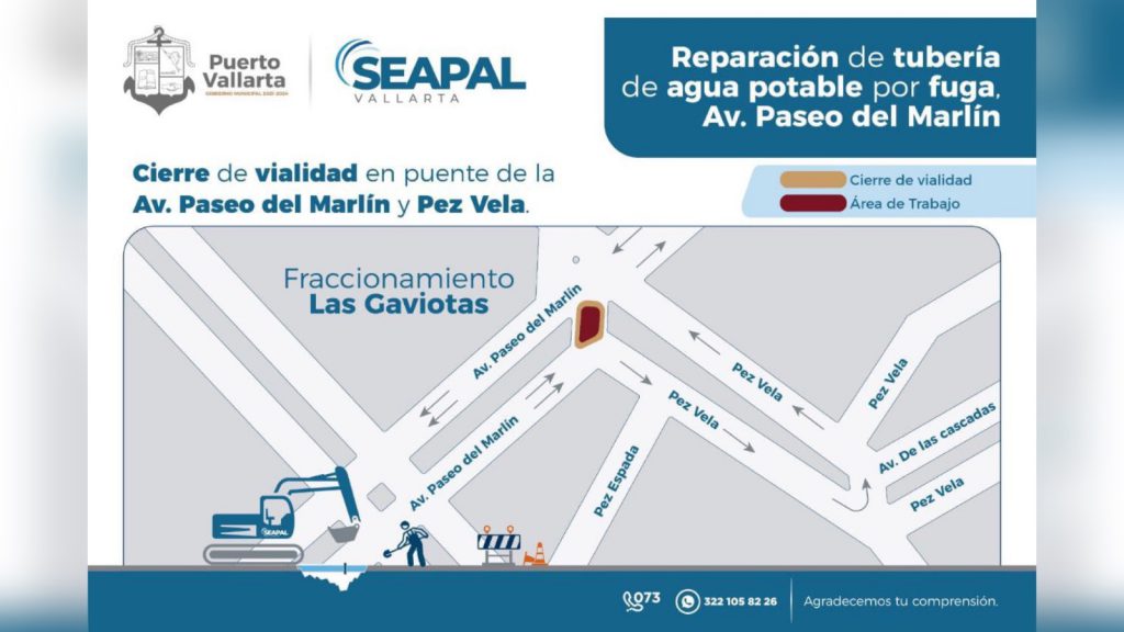 Este lunes 6 de marzo, la administración de Jorge Castillo Núñez en SEAPAL Vallarta, trabajará en la reparación de una tubería por fuga de agua potable en el puente vehicular de la Avenida Paseo del Marlín en su cruce con calle Pez Vela, en el Fraccionamiento Las Gaviotas.