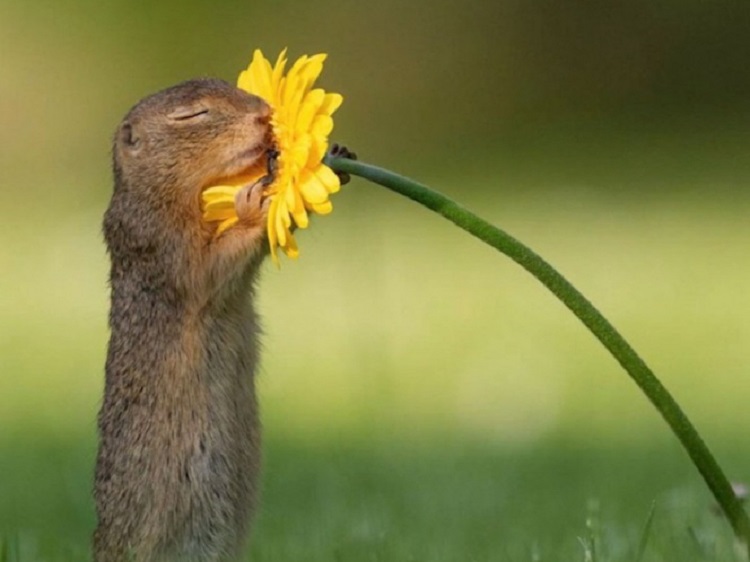 La ardilla se acercó a una flor y comenzó a olerla, colocando su mejilla izquierda sobre ella para luego cerrar los ojos, en clara señal de gozo.