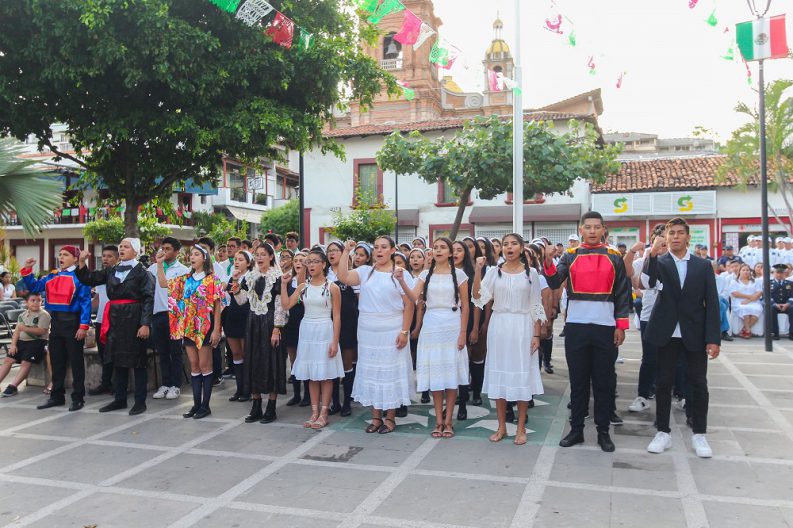 La plaza de Armas de esta ciudad, fue escenario de la sesión solemne de Ayuntamiento celebrada este domingo, en conmemoración al Grito de Independencia de 1810 y el aniversario de la primera entonación del Himno Nacional Mexicano en 1854, a la que se dieron cita autoridades municipales, militares y vallartenses en general.