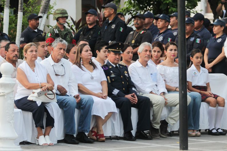 Tras izar la bandera a toda asta con motivo de esta fecha histórica, por parte de la escolta de la 41ª Zona Militar y los elementos de la Dirección de Seguridad Ciudadana, se realizó la entonación del himno nacional mexicano por parte del coro Voces de la Mar y la Banda Municipal, quienes exaltaron una a una las estrofas de este cantico nacional. Asimismo, alumnos de la Preparatoria Arkos participaron con la poesía ‘Suave Patria’, resaltando en sus palabras el orgullo de quienes formamos parte de esta nación.