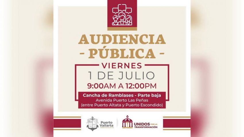 Este viernes 1 de Julio, la Audiencia Pública estará visitando la cancha de basquetbol y área verde ubicada en la avenida Puerto Las Peñas, entre las calles Puerto Progreso, Puerto Cozumel y Puerto Tenacatita, en la colonia Los Ramblases, de 9 de la mañana a 12 del día, donde el presidente municipal y los funcionarios públicos escucharán a la comunidad y darán respuesta oportuna a las distintas problemáticas que planteen los vecinos.
