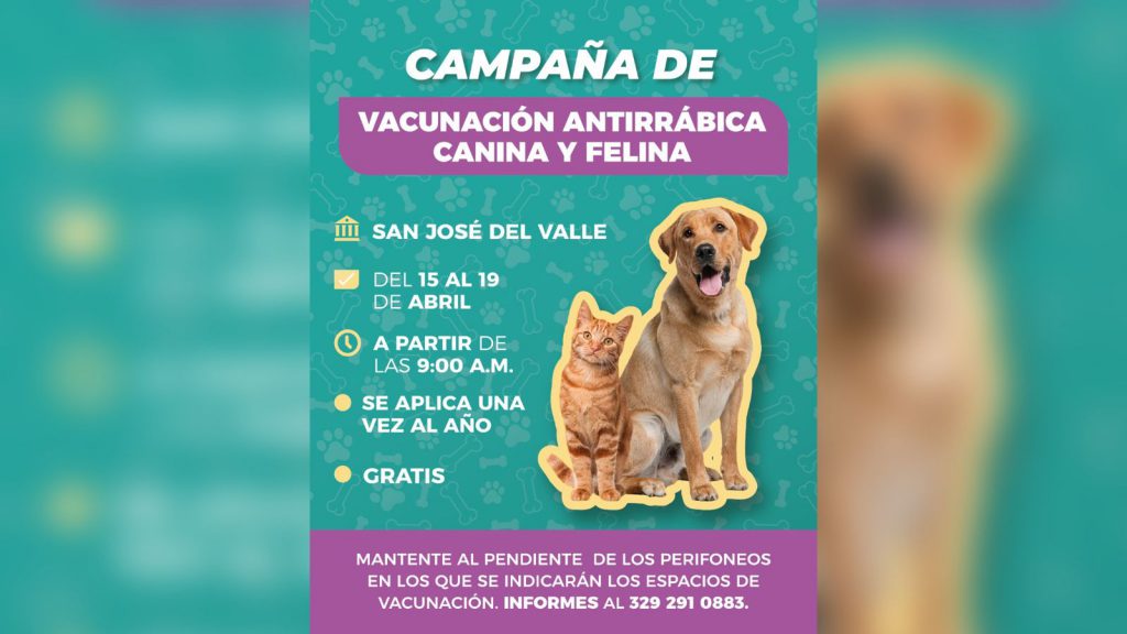 La vacuna es completamente gratuita, se administra una vez por año, y es de suma importancia su aplicación para así evitar que la rabia se propague entre los animales de casa y por supuesto las personas. Para mayores informes los interesados pueden comunicarse al teléfono 3292910883.