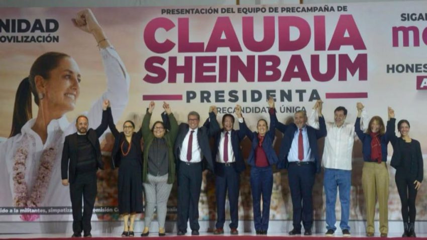 El equipo de precampaña de Claudia Sheinbaum incluye a Mario Delgado, como coordinador; Adán Augusto López, quien será el coordinador político; a Ricardo Monreal, quien se desempeñará como coordinador de enlace territorial, mientras que Gerardo Fernández Noroña será coordinador de enlace territorial.