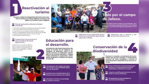 El segundo rubro es “Educación para el Desarrollo” con infraestructura y tecnología para garantizar educación conforme a las necesidades que exige el mundo actual, la tercera “Todo por el Campo de Jalisco” con protección y apoyos para la industria ganadera y agrícola de la región, así como “Conservación de la Biodiversidad” cuyo fin es el desarrollo sin destrucción, para un aprovechamiento sustentable y sostenible de la zona.