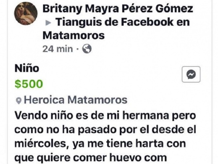 En redes sociales circula la foto de un niño, quien de acuerdo con una publicación de Facebook, está a la venta por 500 pesos en Matamoros, Tamaulipas, ya que “tiene harta” a su tía porque no deja de llorar y de decir que quiere comer “huevo con catsup”.