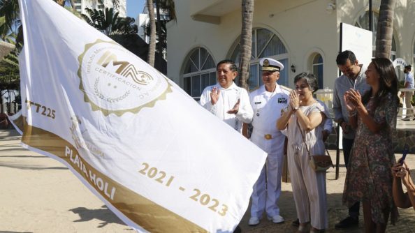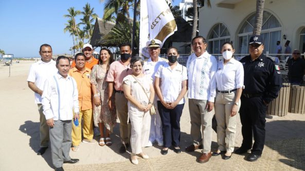 En compañía del Vicealmirante C.G.D.E.M. José Nicolás Aguayo Ramírez, Comandante de la 8ª Zona Naval; la gerente general del Hotel Villa del Palmar, sede de esta entrega, Juliana Batiza Resendiz; Ricardo Cerezo Ortiz, subdirector de Medio Ambiente de Puerto Vallarta, regidores, funcionarios y representantes de hoteles cercanos, el alcalde encabezó el izamiento de la bandera que da cuenta de la certificación de este espacio para el periodo 2021-2023.