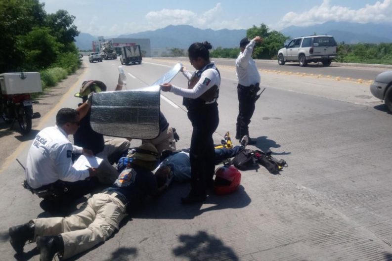 En accidente de motociclista al terminar el puente del Rio Ameca en jurisdicción de Puerto Vallarta, Jalisco, se tuvo que requerir una ambulancia privada, para ello pasaron muchos minutos en una temperatura ambiente de 36 grados; paramédicos y agentes viales tanto de Bahía de Banderas como de Puerto Vallarta tuvieron que hacerle “casita” a la persona lesionada para protegerlo de los rayos solares
