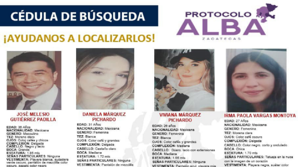 De acuerdo con la ficha de búsqueda, fueron vistos por última vez en Jerez de García Salinas, Zacatecas el pasado 25 de diciembre de 2022. Se trata de las hermanas Daniela Márquez Pichardo de 31 años, Viviana Márquez Pichardo de 25 años, José Melesio Gutiérrez Padilla de 38 años quien es novio de Daniela e Irma Paola Vargas Montoya de 27 años, prima de las jóvenes.