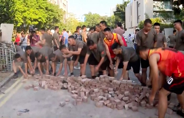 La televisión de Hong Kong mostró a unos 100 hombres vestidos con pantalones cortos y camisetas recogiendo ladrillos, escombros y reparando barreras, antes de regresar al cuartel. El despliegue duró menos de una hora.