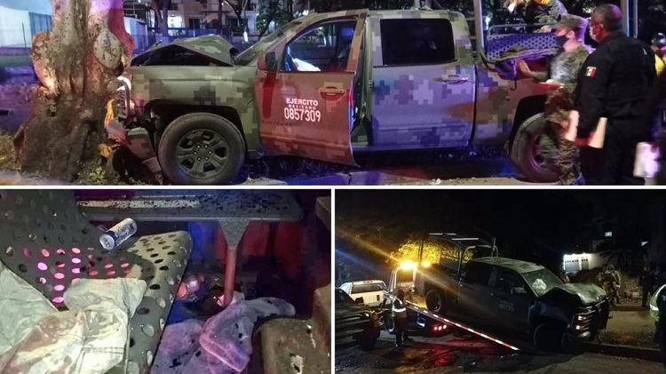 Agentes del Ejército, adscritos al 57 Batallón de Infantería, transitaban a exceso de velocidad en calles de Villahermosa, Tabasco, y con cervezas a bordo de la unidad hasta que se impactaron contra un árbol.