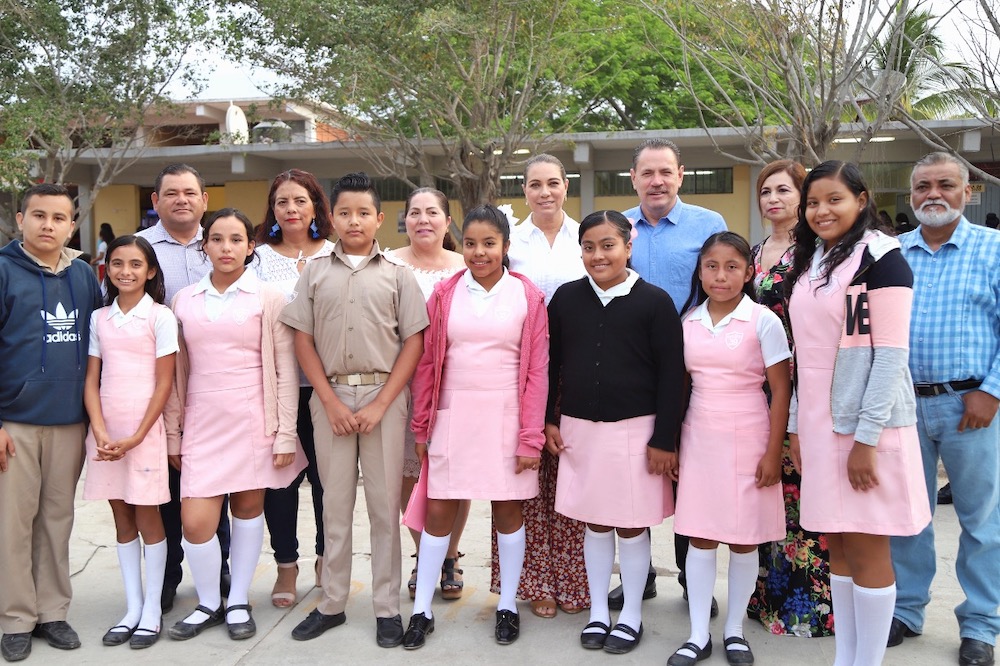 El presidente municipal de Bahía de Banderas, doctor Jaime Cuevas Tello y su esposa, la presidenta del DIF municipal, L.T.S Ana Esperanza Berumen de Cuevas, encabezaron los Honores a la Bandera en la Escuela Secundaria Fray Junípero Serra de Bucerías, donde el alcalde dio respuesta positiva a diferentes solicitudes del plantel.