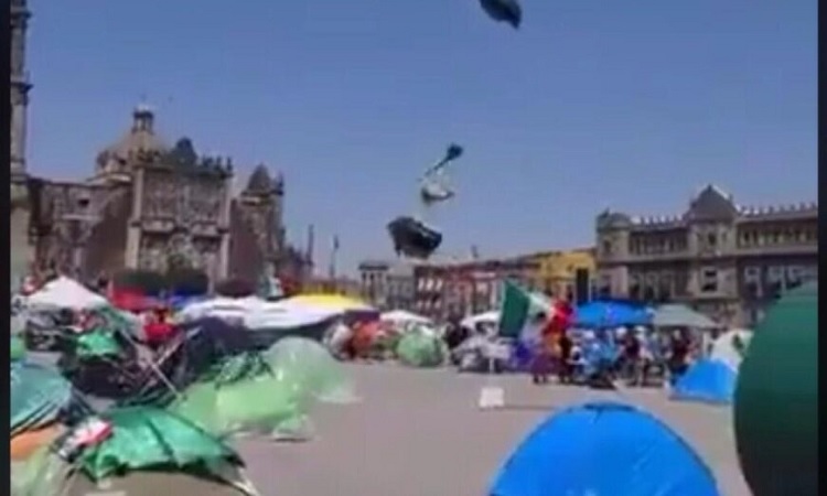 “¡Ridículos!”, se oye de fondo en el video, el cual muestra las tiendas de campaña arremolinadas en el aire. “¡Están volando las casas de campaña!” –dice quien graba mientras otro aplaude –. “No, o sea, ¿en serio? ¡Esto está increíble! ¡Para esto me gustabas! No puede ser posible esto. Estamos en vivo y en directo. ¡Las casas de campaña están volando!”, señaló, entre risas de la gente que caminaba por el zócalo.