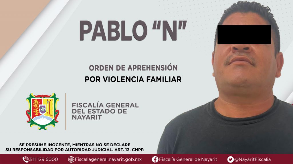 La Fiscalía General del Estado, a través de la Agencia de Investigación Criminal, dio cumplimiento a una orden de aprehensión en el municipio de Bahía de Banderas contra Pablo «N» por su presunta participación en hechos que, según la apreciación de la ley, configuran el delito de violencia familiar.