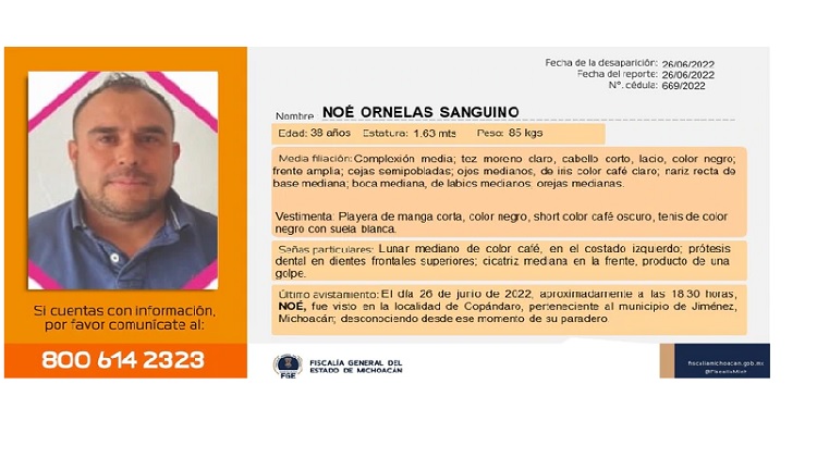 Según reportes oficiales, Noé Ornelas Sanguino fue encontrado sin vida este lunes, sobre el tramo carretero La Soledad-La Estancia, ranchería de Los Tres Cerros, municipio de Villa Jiménez, Michoacán, luego de que había sido reportado como desaparecido, el pasado domingo 26 de junio.