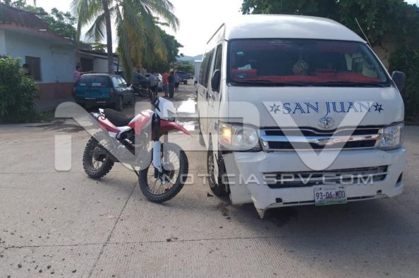 Este vehículo de alquiler le cortó la circulación a una motocicleta Italika, tipo Cross, que se impactó en la parte del lado derecho, resultando golpeados dos masculinos que iban a bordo, el conductor y el acompañante, quienes afortunadamente no ameritaban ser trasladados a algún hospital.