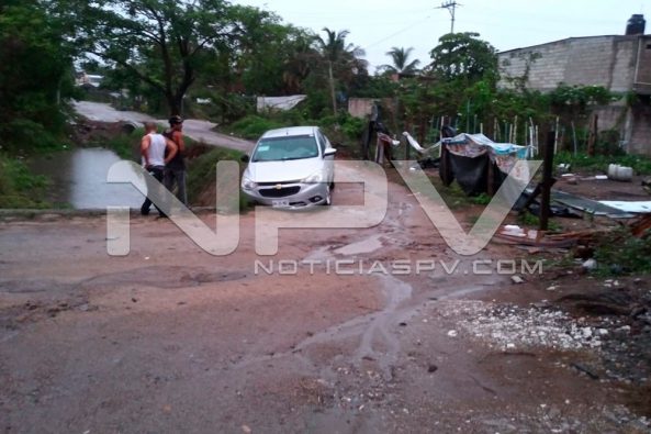 Taxi por poco y cae a un canal de desagüe pluvial luego de que derrapó con los neumáticos al circular por el acotamiento de la avenida de Rincón del Cielo en Mezcales.