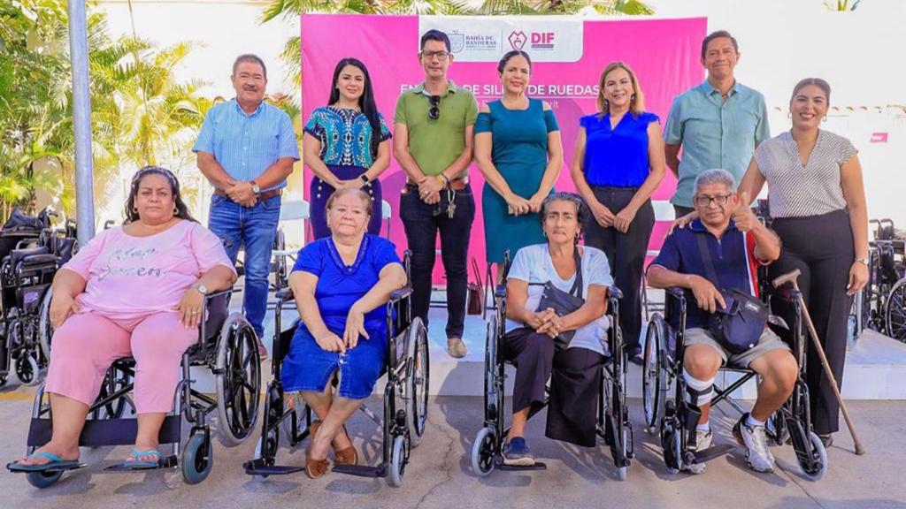 Bahía de Banderas, Nay., a 14 de noviembre de 2023.- Esta mañana en las instalaciones del DIF Municipal en la localidad de Valle de Banderas, su presidenta, Perla Villalvazo Amaya, en compañía de regidores, entregó 37 de un total de 50 sillas de ruedas a ciudadanos que las necesitan debido a que cuentan con algún problema que limita su movilidad.
