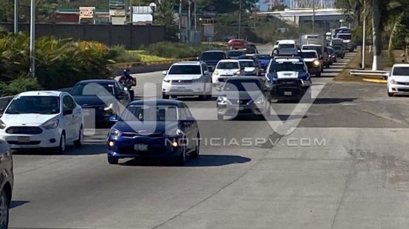 Terrible tráfico de vehículos se generó sobre el carril de norte a sur del Boulevard Riviera Nayarit, que causó un gran caos vial desde el puente el Marlin, en el ingreso a Nuevo Vallarta, en Bahía de Banderas, hasta el puente Ameca, en el ingreso a Puerto Vallarta.