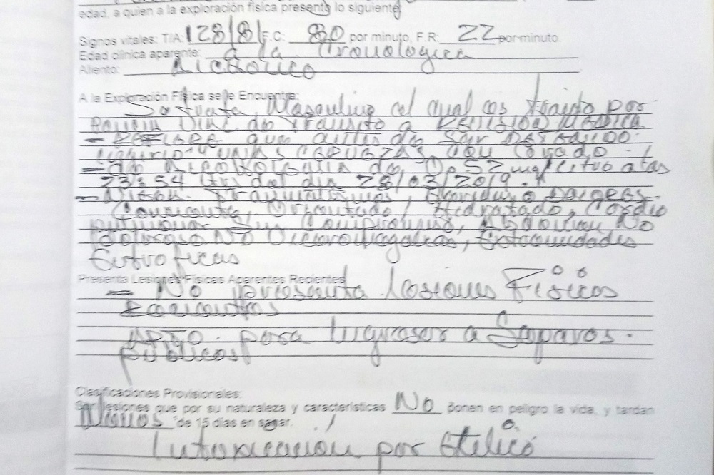 Sin embargo, con fecha 29 de marzo 2019, la medico legista, Martha Bimbela, informa a la agente del ministerio público de Valle de Banderas, licenciada, Kilpatrik NilsaXak Altamirano Santana, adscrito a la Unidad de Investigación del Sistema Penal Acusatorio de la Región V con sede en Valle de Banderas, que se apersonó en la cárcel pública para realizar el certificado médico de lesiones, ebriedad y toxicológico al imputado en punto de las 8 de la mañana de este mismo día y tras auscultarlo determinó que no presentó signos presuntos de intoxicación por alcohol, tampoco de drogas ni lesiones visibles a simple vista y para las 8 con 26 minutos concluyó que clínicamente no estaba ebrio y no estaba intoxicado por drogas de abuso. Lo que contradice el dictamen del médico perito de la cárcel preventiva antes mencionado que casi ocho horas antes había detectado intoxicación por alcohol en la misma persona.