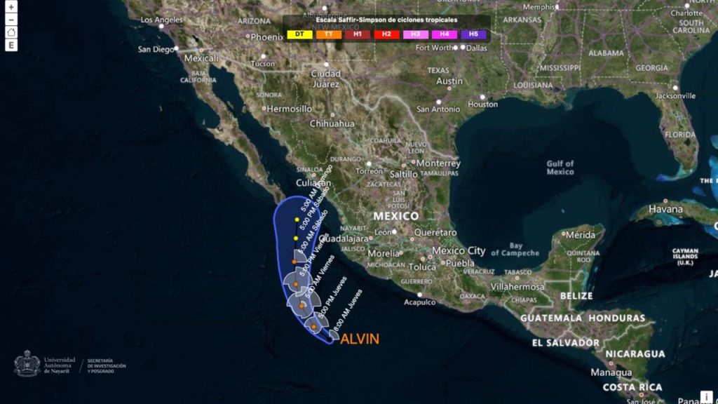 La tormenta tropical Alvin se formó esta mañana a partir de la depresión tropical Uno-E en aguas del Pacífico, a 1,080 kilómetros al sur-suroeste de Baja California Sur. De acuerdo con la Secretaría de Investigación y Posgrado a través de Meteorología UAN Nayarit, el fenómeno no representa riesgo para Nayarit, ya que se espera que se degrade antes de acercarse a las costas.