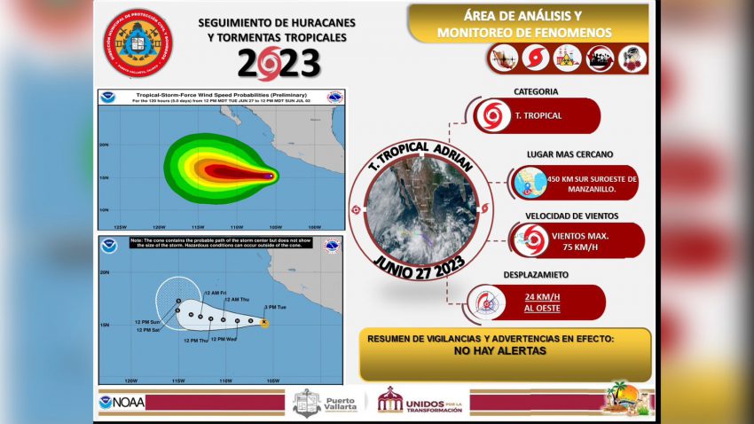 Se forma la primera tormenta tropical del año en el Pacífico mexicano. La Tormenta «Adrián» se encuentra alejada de territorio mexicano y no representa un peligro directo para Jalisco y Nayarit aunque podría generar lluvias en los próximos días.